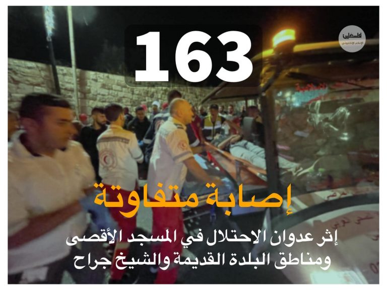 افاد الهلال الاجمر الفلسطيني بوقوع 163 إصابة خلال مواجهات مع قوات الاحتلال في المسجد الأقصى المبارك والشيخ جراح وباب العامود، تم نقل 83 إصابة لمستشفيات القدس وباقي الاصابات تم علاجها ميدانياً.
