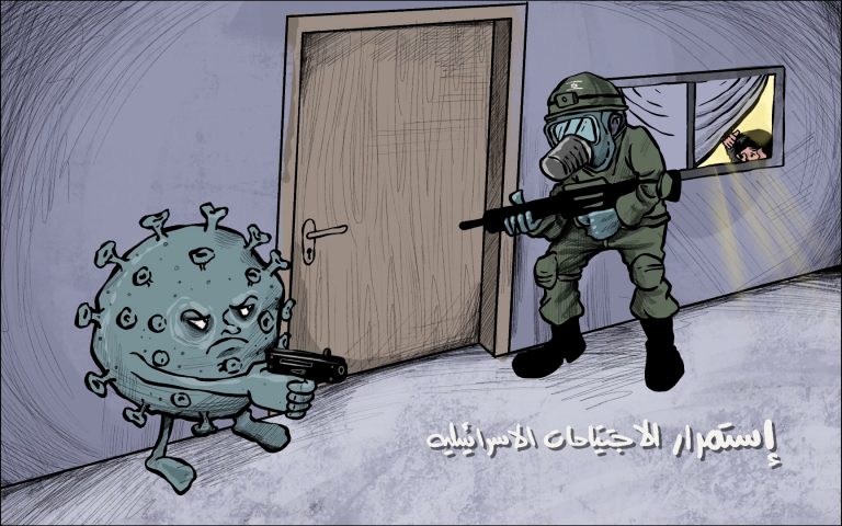 لم يسلم الفلسطينيون من اجتياحات الاحتلال خلال انتشار وباء كورونا.. وهكذا وثق الجريمة فنان الكاريكاتير محمد سباعنة