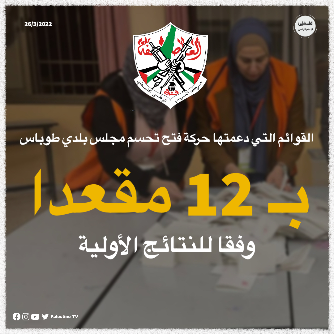 2022/3/26- حسمت القوائم التي دعمتها حركة فتح مجلس بلدي طوباس بـ 12 مقعدا وفقا للنتائج الأولية.