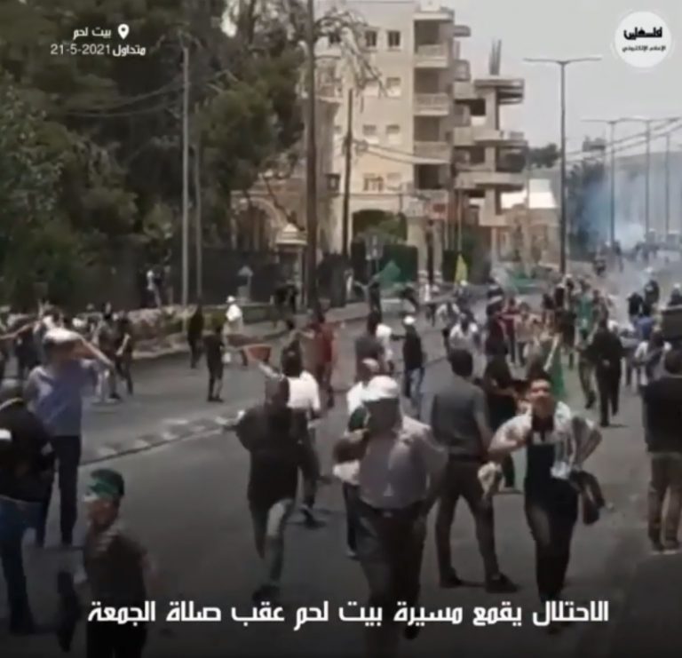 أصيب عشرات المواطنين بالاختناق بالغاز المسيل للدموع، اليوم الجمعة، خلال قمع قوات الاحتلال مسيرة سلمية في بيت لحم اسنادا للقدس وغزة وأهلنا في أراضي الـ48.