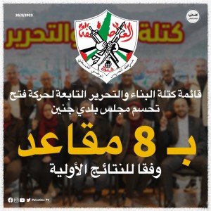 2022/3/26 – حسمت قائمة كتلة البناء والتحرير التابعة لحركة فتح مجلس بلدي جنين بـ 8 مقاعد وفقا للنتائج الأولية.