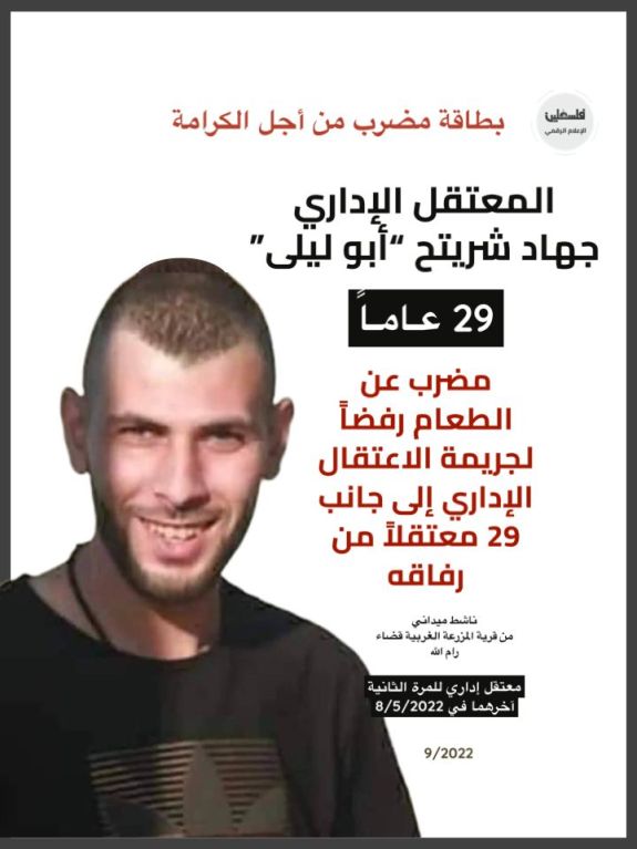 يخوض الأسير الإداري جهاد شريتح إضرابا عن الطعام رفضا لجريمة الاعتقال الإداري إلى جانب 29 من رفاقه في سجون الاحتلال.