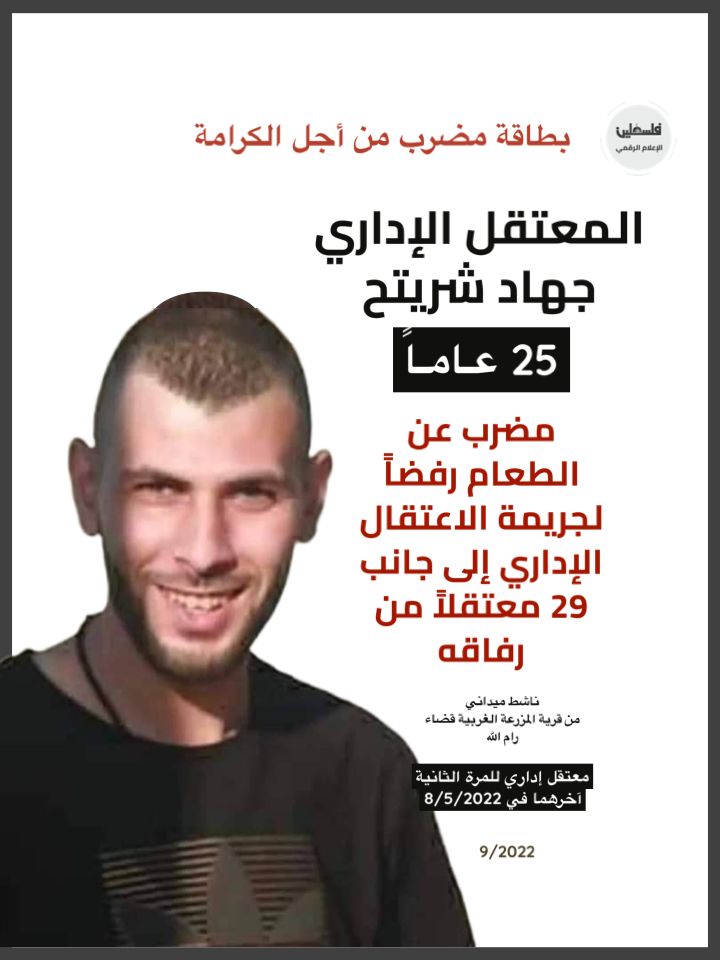 يخوض الأسير الإداري جهاد شريتح إضرابا عن الطعام رفضا لجريمة الاعتقال الإداري إلى جانب 29 من رفاقه في سجون الاحتلال.