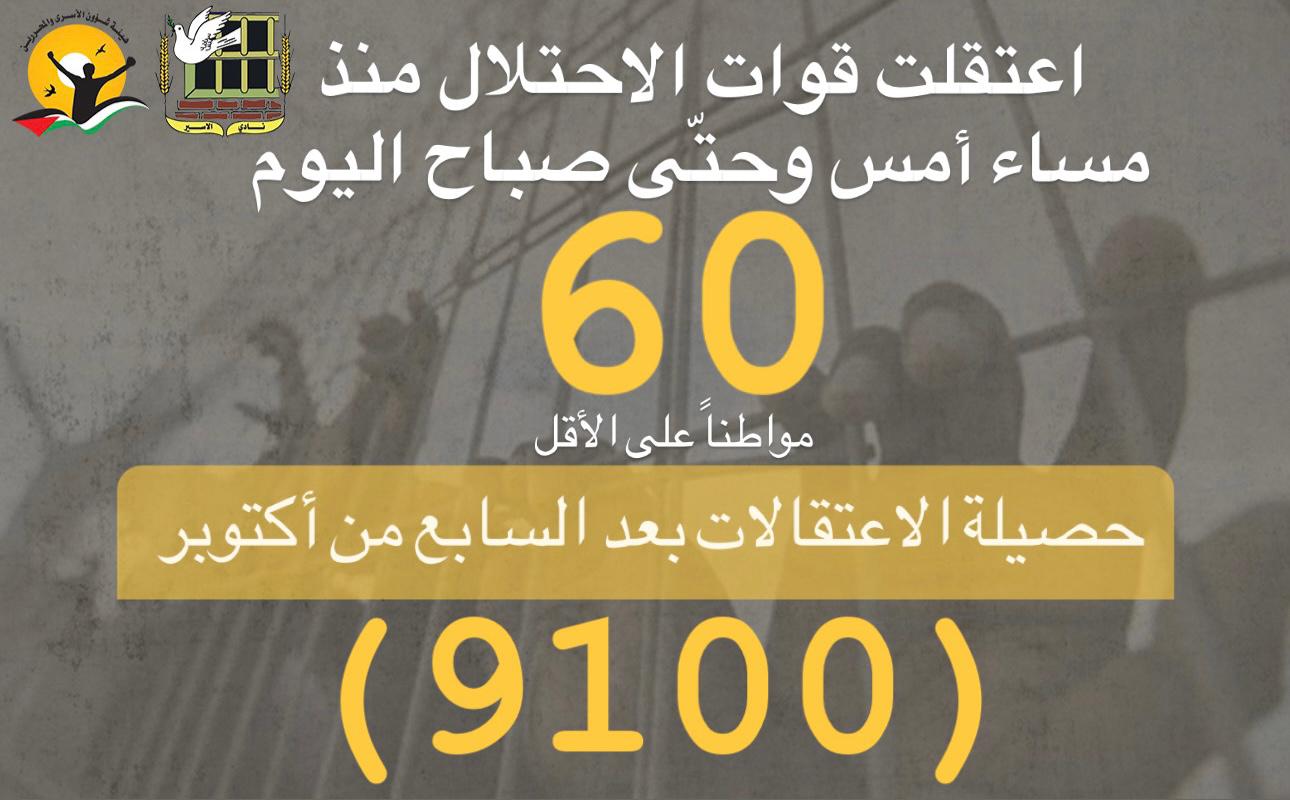 وبذلك ترتفع حصيلة الاعتقالات بعد السابع من أكتوبر، إلى أكثر من (9100)، وهذه الحصيلة تشمل من جرى اعتقالهم من المنازل، وعبر الحواجز العسكرية، ومن اضطروا لتسليم أنفسهم تحت الضغط، ومن احتجزوا كرهائن.