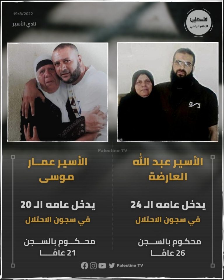 وذكر منتصر سمور مدير نادي الأسير في جنين، أن الأسير عبد الله أحمد فارس العارضة (43 عاما) من بلدة عرابة دخل عامه الـ 24 في سجون الاحتلال، وهو معتقل منذ تاريخ 19/8/1999، وأصدر الاحتلال بحقه حكما بالسجن 26 عاما، فيما دخل الأسير عمار صبحي عثمان موسى (44 عاما) من بلدة سيلة الظهر عامه الـ 20، وهو معتقل منذ 19/8/2003، وأصدر الاحتلال بحقه حكما بالسجن لمدة 21 عاما.