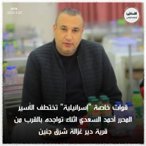 وذكر منتصر سمور مدير نادي الأسير في جنين، أن قوات خاصة “إسرائيلية” للاحتلال متنكرة بمركبة تحمل لوحة تسجيل فلسطينية إختطفت الأسير المحرر أحمد سعيد السعدي أثناء تواجده بالقرب من قرية دير غزالة شرق جنين.