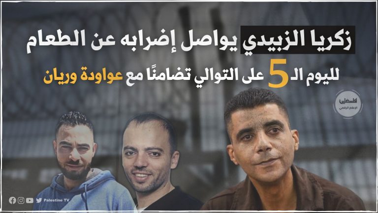 لليوم الخامس على التوالي يواصل الأسير البطل زكريا زبيدي إضرابه عن الطعام تضامنًا مع المعتقلين خليل عواودة ورائد ريان، ويخوض زبيدي هذا الإضراب الإسنادي رغم الظروف الصعبة التي يواجهها في عزله الانفرادي داعيًا جماهير شعبنا لنصرة المضربين ضد اعتقالهما الإداري.