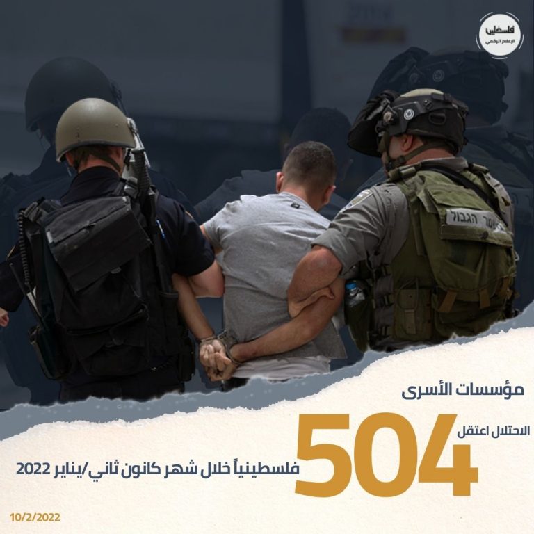 رام الله: اعتقل الاحتلال خلال شهر كانون الثاني/ يناير 2021، (504) فلسطينيا، بينهم (54) طفلاً منهم طفل أقل من 12 عاماً، و(6) نساء، وبلغ عدد أوامر الاعتقال الإداري الصّادرة (96) أمراً، بينها (51) أمراً جديداً، و(45) أمر تمديد.