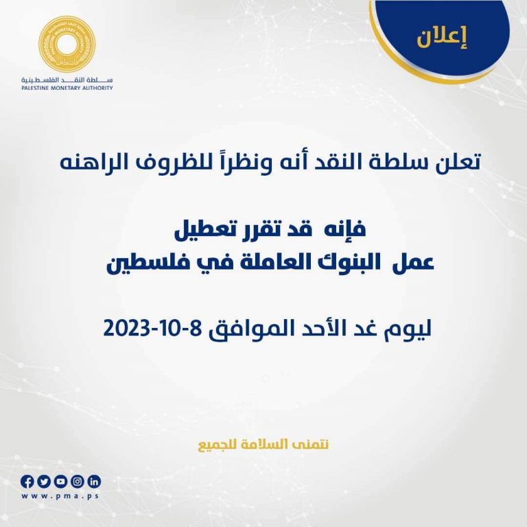 سلطة النقد: تعطيل عمل البنوك العاملة في فلسطين ليوم غد الأحد الموافق 2023.10.8