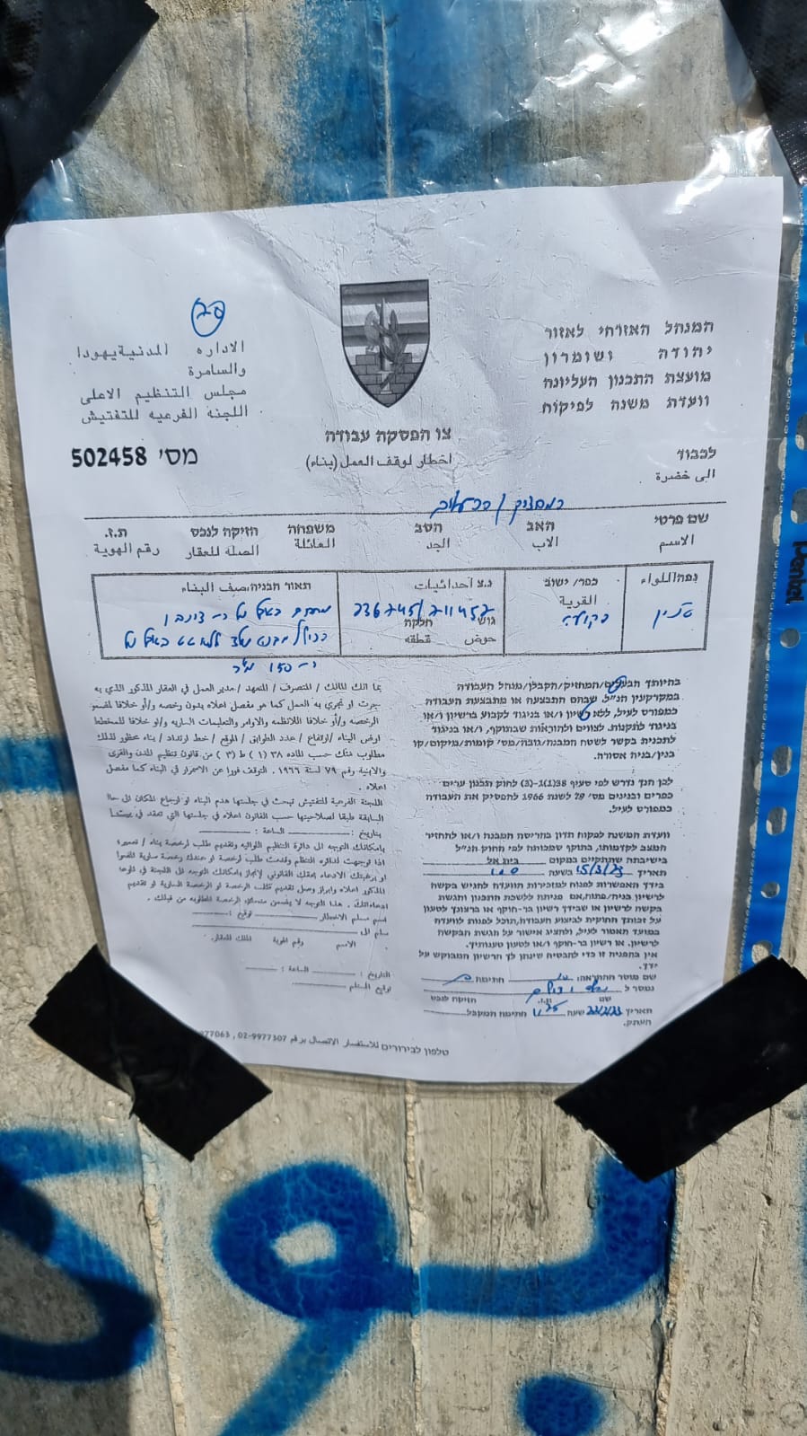 أخطرت سلطات الاحتلال، اليوم الإثنين، بوقف البناء في عدة منازل ومنشآت زراعية في قرية فقوعة، شمال شرق جنين.
