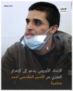 دعا الاتحاد الأوروبي سلطات الاحتلال الإسرائيلي، اليوم الخميس، إلى الإفراج الفوري عن الأسير المقدسي أحمد مناصرة (20 عاما).