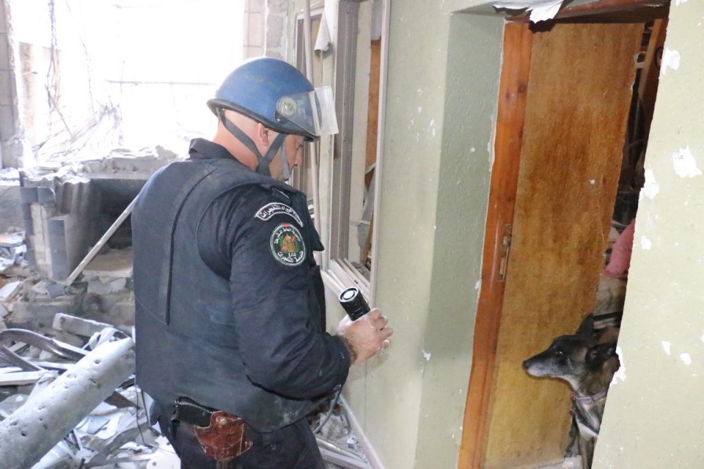 وذكرت إدارة العلاقات العامة والإعلام بالشرطة، أن فريقاً من وحدة هندسة المتفجرات ووحدة الكلاب البوليسية (K9) في شرطة محافظة نابلس بإسناد من قوة من مديرية الشرطة والشرطة الخاصة، وقوات الأمن الوطني والأجهزة الأمنية والدفاع المدني، وبالشراكة مع بلدية نابلس واطفائيتها وشركة كهرباء الشمال، حيث قام فريق من هندسة المتفجرات بمسح كامل لحوش العطعوط في حارة الياسمينة في البلدة القديمة في نابلس بحثاُ عن اي مخلفات قد تلحق الأذى بالمواطنين او اجساماً مشبوهة قد تركت في المكان عقب العدوان الاسرائلي على البلدة.