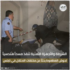 قامت وحدة هندسة المتفجرات بشرطة محافظة نابلس باجراء مسح هندسي كامل لمنطقة حوش العطعوط في البلدة القديمة في نابلس بحثاُ عن اي مخلفات للاحتلال بعد مداهمته من قبل قوات الاحتلال قبيل أيام.