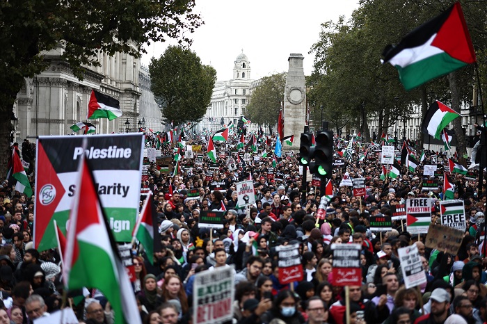 تظاهر عشرات الآلاف من البريطانيين، مساء اليوم السبت، في العاصمة لندن، تضامنًا مع شعبنا، وتنديدا بالعدوان الإسرائيلي المتواصل على قطاع غزة.