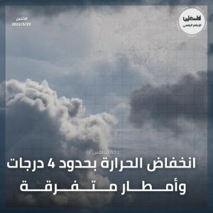 توقعت الأرصاد الجوية أن يكون الجو اليوم الاثنين، غائما جزئيا إلى صاف وباردا نسبيا نهارا وباردا ليلا خاصة فوق المناطق الجبلية، ويطرأ انخفاض طفيف اخر على درجات الحرارة لتصبح أقل من معدلها السنوي العام بحدود 4 درجات مئوية، وتبقى الفرصة مهيأة في ساعات الصباح لسقوط أمطار متفرقة فوق بعض المناطق خاصة الشمالية والوسطى والرياح غربية الى شمالية غربية معتدلة الى نشطة السرعة مع هبات قوية أحيانا تصل سرعتها احيانا الى 60 كم/ساعة والبحر متوسط ارتفاع الموج الى مائج.