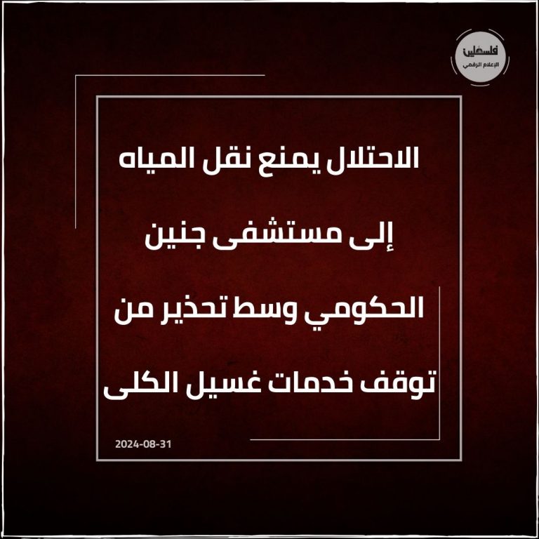 وحذر مدير مستشفى جنين الحكومي وسام بكر، من توقف خدمات غسيل الكلي، في حال استمر الاحتلال بمنع دخول المياه.