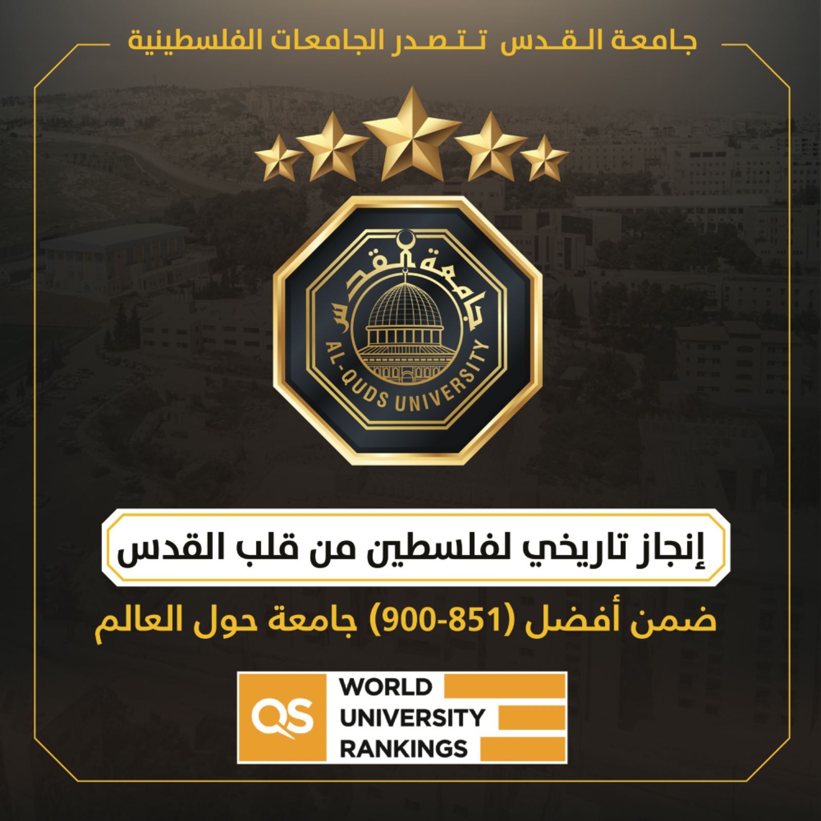 تصدرت جامعة القدس الجامعات الفلسطينية وفقًا لتصنيف مؤسسة QS العالمي للعام 2025 ضمن فئة أفضل 851-900 جامعة حول العالم، كأول جامعة فلسطينية تدخل هذه الفئة، متقدمةً 180 موقعاً في التصنيف العالمي للعام 2025، بمعدل تقدم 10.2% عالميًا.