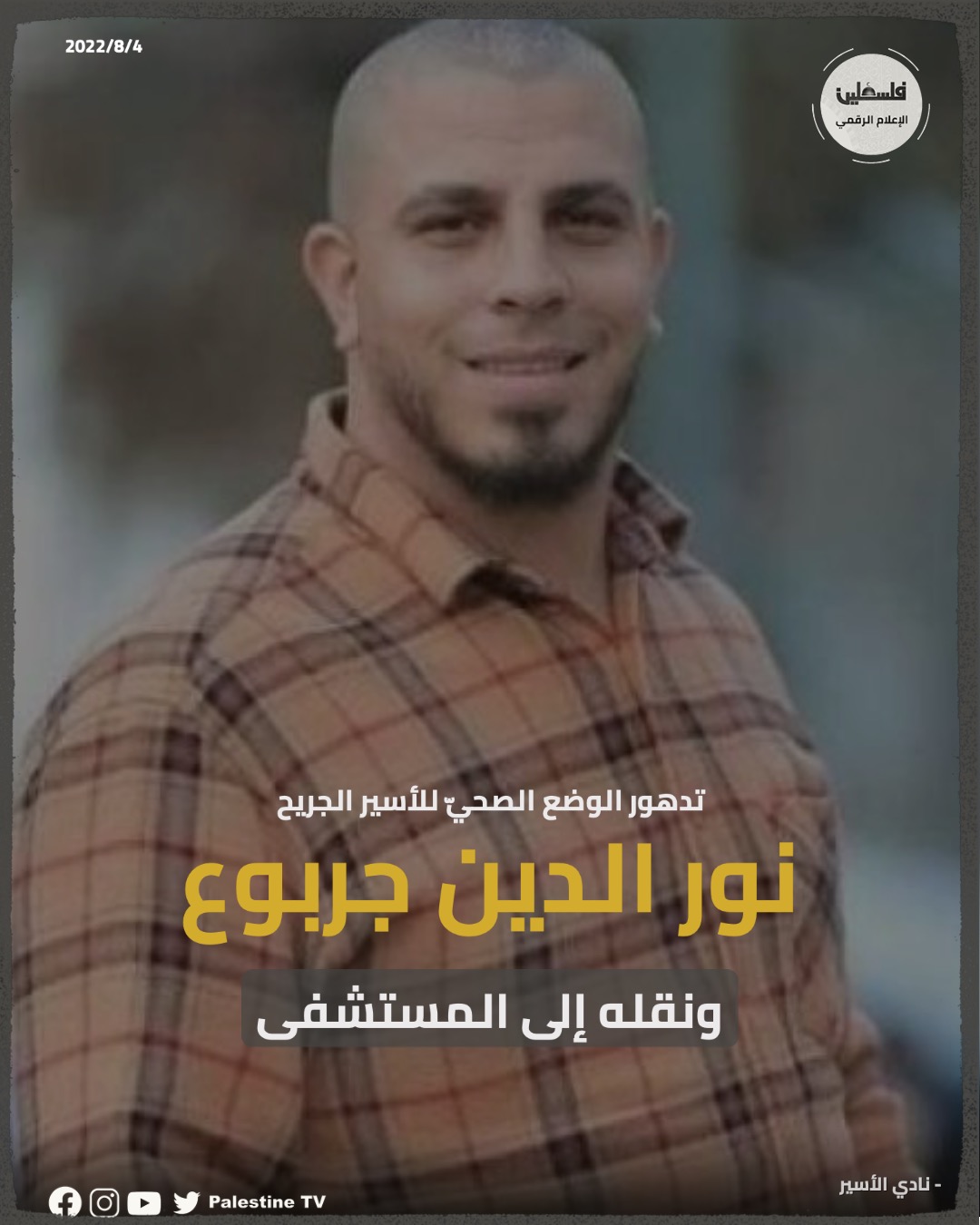 قال نادي الأسير إنّ تدهورا جديدا طرأ على الوضع الصحي للأسير الجريح نور الدين جربوع (27 عاما) من جنين، وعلى إثره نقل من سجن “عيادة الرملة” إلى إحدى المستشفيات المدنية التابعة للاحتلال.