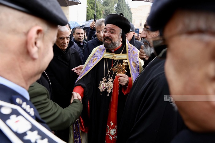 واستقبل الموكب على بلاط ساحة المهد محافظ بيت لحم كامل حميد، ورئيس اللجنة الرئاسية العليا لمتابعة شؤون الكنائس في فلسطين رمزي خوري، ورئيس بلدية بيت لحم حنا حنانيا، ووزيرة السياحة والآثار رولا معايعة، ومدير عام شرطة المحافظة العميد ثابت السعدي، وقائد منطقة بيت لحم العميد ناضر عمر، وكاهن الرعية ووجهاء الكنيسة السريانية.